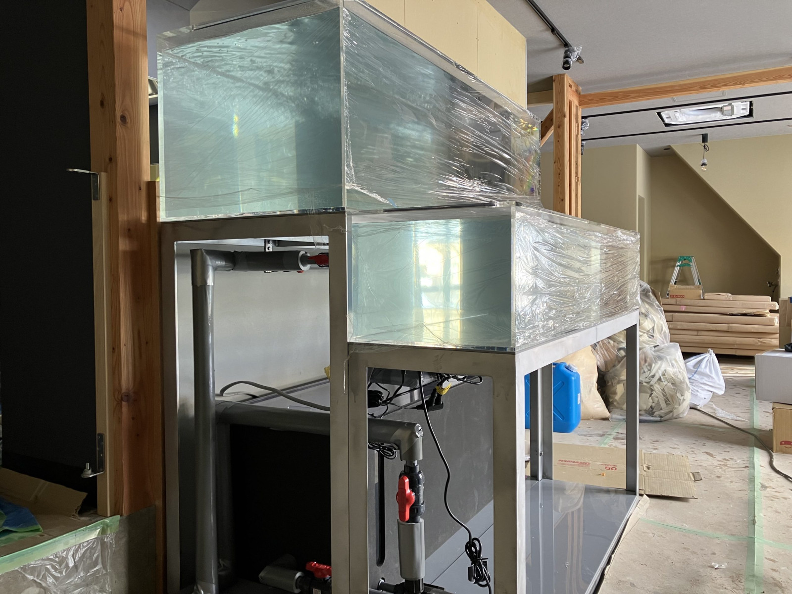 手前の水槽は、カキやホタテなど貝類を入れる事を想定し設計しております。奥の水槽は、毛ガニを入れる為の設計となっております。